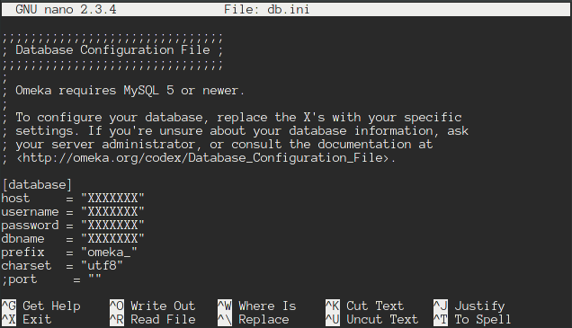 Now you can edit your file, changing the XXXXXXXX values to the appropriate values for your system, but keeping the double quotes (") intact. The field host should be localhost, since the database is on the same server. For username and dbname, enter the user name, password, and database name you generated in step 2. For my setup, these values are:
